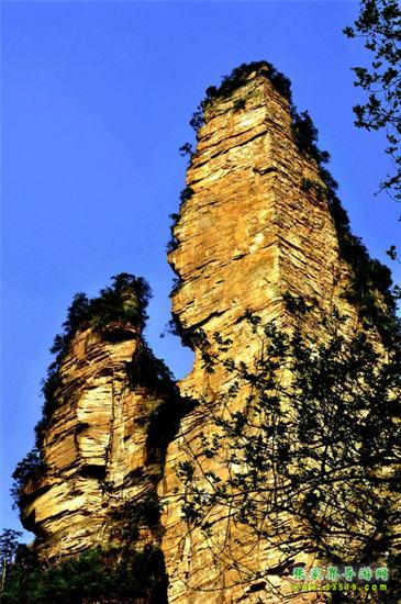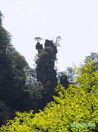 有緣千里來相會(huì),萬水千山總是情。“曾經(jīng)滄海難為水,除卻巫山不是云。”前方這支高300多米的石峰,是不是很像一對(duì)情侶?男的身材高大,頭戴頭盔,身披鎧甲,右手摟著女人的腰,左手撫著女人的肩膀。女的身材豐滿,面容清秀,兩眼深情地凝望著自己的愛人。兩人含情脈脈、情意綿綿的樣子好像有千言萬語三天三夜也說不完。您猜猜看,他們是在互相傾訴離別的痛苦呢,還是在相互表達(dá)重逢的喜悅?有詩人這樣寫道:“半是愛憐半是悲,少從軍伍老方回。糟糠啜泣將軍淚,化作春風(fēng)滿谷吹。”相傳這男的是明代抗倭?xí)r一位土家族將軍,一打完仗就千里迢迢,風(fēng)塵仆仆地趕回來和愛人相會(huì)。他連頭盔和鎧甲都沒來得及換!這女的自從和心愛的情人離別后,朝思暮想,茶飯不思,“衣帶漸寬終不悔,為伊消得人憔悴”。她清秀的臉上仍顯得有幾分憔悴,卻格外楚楚動(dòng)人!此情此景,您看到了嗎?您看到的是石頭,還是愛情?山風(fēng)吹在石壁上的聲音和著金鞭溪的流水聲,好像一聲聲祝福:祝您愛情美滿!愿天下有情人終成眷屬!