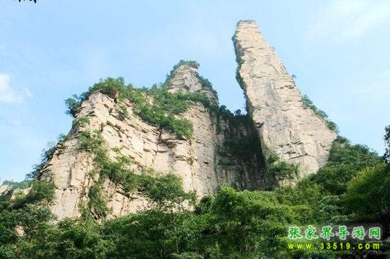 說到討好老婆,豬八戒可謂這方面的專家。您回頭看,不遠(yuǎn)處一支長有一些小樹的石峰,頂部分了丫,像一個(gè)英文字母“Y”,很像頭戴綠色小帽的豬八戒背著他身材嬌小的老婆(有人開玩笑說他戴的是“綠帽子”,背的是“小老婆”)。小老婆撐著一把小陽傘,還正在背上一扭一扭的呢!八戒的嘴最形象,嘟得老長,好像背了很久,累得不行了,正喘著粗氣——您千萬可別看不起豬八戒先生,他魅力足著呢,他不但能吃會(huì)玩、開朗大方,而且溫柔多情,雖說長相“安全”了一點(diǎn),但特別擅長哄女孩子開心,不少窈窕淑女就喜歡他這種“好逑的君子”。