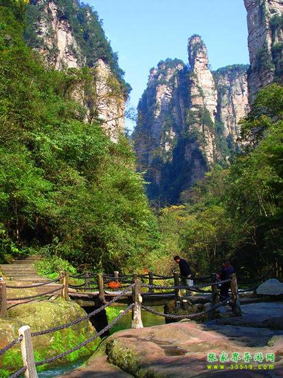 金鞭溪因流經(jīng)金鞭巖而得名,全長5700米,穿行於絕壁奇峰之間,溪谷有繁茂的植被,溪水四季清澈,被稱為“山水畫廊”、“人間仙境”。有詩贊曰:“清清流水青青山,山如畫屏人如仙,仙人若在畫中走,一步一望一重天”。途中你會(huì)看到點(diǎn)歌臺(tái),那里有土家姑娘時(shí)刻準(zhǔn)備為游人唱民族歌曲,只要付十元錢她們就會(huì)為你引吭高歌,當(dāng)然,如果你不想花這個(gè)錢,也可以在一邊聽聽別人點(diǎn)的歌,聽完后走人。
