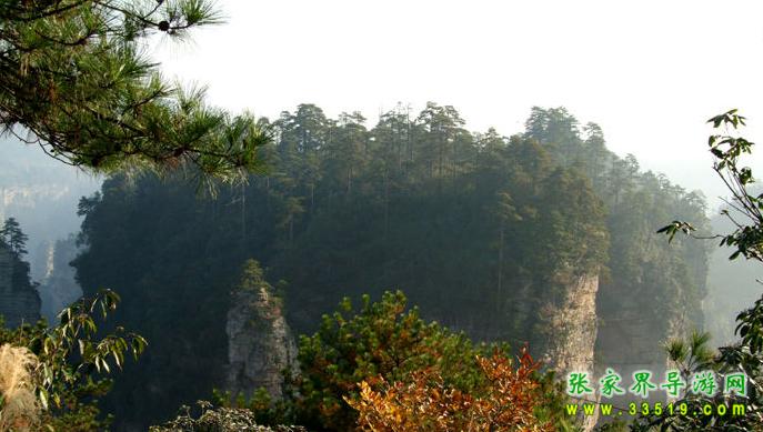 立黃石寨頂東北沿隔澗而望,對(duì)面一巖體臺(tái)地,高200余米,頂部面積約數(shù)百畝,四圍陡峭如削。其上長(zhǎng)滿黑黝黝的樹木,借助望遠(yuǎn)鏡,可看清有武陵松等,蒼翠蓊郁,猶如綠色迷宮。