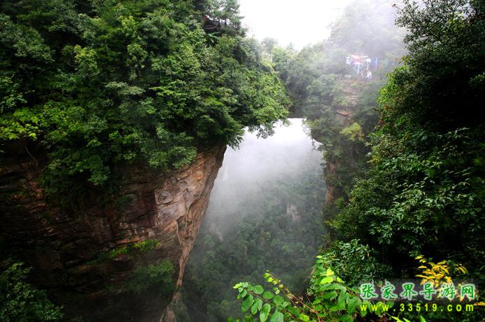 醉月臺西去兩百余米,有一座50多米長,15米厚的條石搭在兩座山峰之間,其下嵌空350多米,這就是名聲赫赫的天下第一橋。橋約20米長,最薄處約4米厚,最窄處只有2米多寬。與兩邊橋墩合為一體,天衣無縫。橋面兩側(cè)、橋頭兩壁上端均有綠樹簇擁,郁郁蔥蔥,而橋下洞壁宛若刀削,草木不生。望橋臺有三處,其一在橋邊20米處,俯視橋面,但見兩側(cè)綠叢中間,一段平路通向彼峰,橋洞依稀,下端被密林遮住,往來其間,無甚驚險。其二在橋左側(cè)30多米處的石壁上,透過樹枝向右下俯視,可見橋洞側(cè)面一部分,不知其下幽深幾許,若逢雨后初晴,有云霧在眼前突涌,亦不明其由來。最扣人心弦的是繞過右邊長達1200多米的“U”形深谷,隔200余米的澗谷向東觀賞,橋面橋洞,橋壁橋底,一覽無余。它造型巍峨,偉岸雄奇,高峻深險,形神逼真,確屬大自然神工鬼斧之杰作。