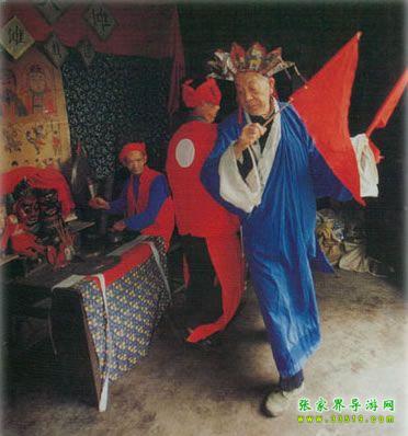 儺戲在湘西土家族地區(qū)也稱儺堂戲、儺神戲,它與土家族原始巫教、巫術的關系極為密切。土家族先民信奉的神有儺神、八部大神、土地神等,作為一種宗教活動,這種原始信仰與社會生產活動、文娛活動及民族習俗是融為一體的,因此儺戲最先的“沖儺還原”帶有明顯迷信色彩,土家族群眾中有“一儺沖百鬼,一愿了千神”的說法,湘西土家族人干脆叫它為“神戲”。湘西土家族儺戲的發(fā)展過程大體是儺、儺舞、儺儀然后才產生儺戲。儺舞源于久遠的蒙昧時期,土家先民們在同大自然作斗爭、同毒蟲猛獸作斗爭,便產生了化裝護面、在鼓樂聲中奔騰呼號、沖殺跳躍的原始儺舞,其所模擬的鳥雀舞、猿猴舞、熊舞等頗為壯觀。儺舞與儺這種驅鬼消災的祭祀儀式結合后,增加了祈求人獸平安、五谷豐登、緬懷祖先、勸人去惡從善、以及傳播生產知識等內容,這就逐漸形成了兼?zhèn)潢U弘教義及娛樂性質的祭祀風俗歌舞。[2]土家族儺戲就是在此基礎上發(fā)展起來的。部分土家族學者認為土家族儺戲的遠源可以追溯到戰(zhàn)國時代的《九歌》,《九歌》是土家族儺戲的雛形,他們的依據是當時楚國的沅湘流域,人們“信巫鬼、重淫祀”(《漢書·地理志》),從而使得“陰陽人鬼之間,又或不能無褻慢淫荒之雜”(宋代朱熹《楚辭集注》)。屈原正是加工整理了這一類“鄙陋”之詞,才創(chuàng)作出《九歌》、《天問》等名篇。也有部分學者不贊同這種論點,他們認為土家族儺在宋代還停留在儺祭和儺舞階段,最遲到明代,土家族儺才發(fā)展成為儺戲[3]。嘉靖《常德府志》記載:“歲除,歲將盡數(shù)日,鄉(xiāng)村多用巫師,朱裳鬼面,鑼鼓喧舞竟夜,名曰還儺。”文中未點明“儺戲”二字,但卻使用了“還儺”一詞,這與今天民間對儺戲的稱呼相似。又據清乾隆《永順縣志》載:“永俗酬神,必延辰郡巫師唱演儺戲,……至晚,演儺戲。敲鑼擊鼓,人各紙面一,有女裝者,曰孟姜女;男扮者,曰范七郎。”在土家族儺戲中,孟姜女傳說故事占著非常重要的地位。在湘西土家族地區(qū),儺戲一般有二十四正戲,即二十四戲神。每次儺儀結束時,巫師要用香火在黃裱紙上燒二十四個洞,以表示奠祭二十四戲神。民間有諺語:“儺神菩薩不識字,只要二十四個圈圈滿。”在二十四儺神中,被稱為勾愿神的姜女、范郎是還儺愿時非常重要的兩位神靈。在儺戲中,《孟姜女》是整場的高潮,平時,儺戲唱完后,由沒下裝的孟姜女、范郎去向主人家及觀眾“拜臺”,以示“了愿”。清代中期以后,儺戲吸取了花燈、陽戲、高腔等其他地方戲劇劇種的唱腔和劇目,逐漸變得日益成熟。我們仔細查看了全國371個劇種,發(fā)現(xiàn)儺戲、花燈戲有著相同的班社,也就是說一個演出班社可以演出儺戲、花燈戲兩個劇種。這段時期,儺戲已作為獨立戲劇劇種參加演出。由于儺戲是由巫儺法事演變而成的戲劇形式,經歷著巫儺法事(驅鬼祭祀)、儺壇上戲和儺堂正戲的發(fā)展過程。