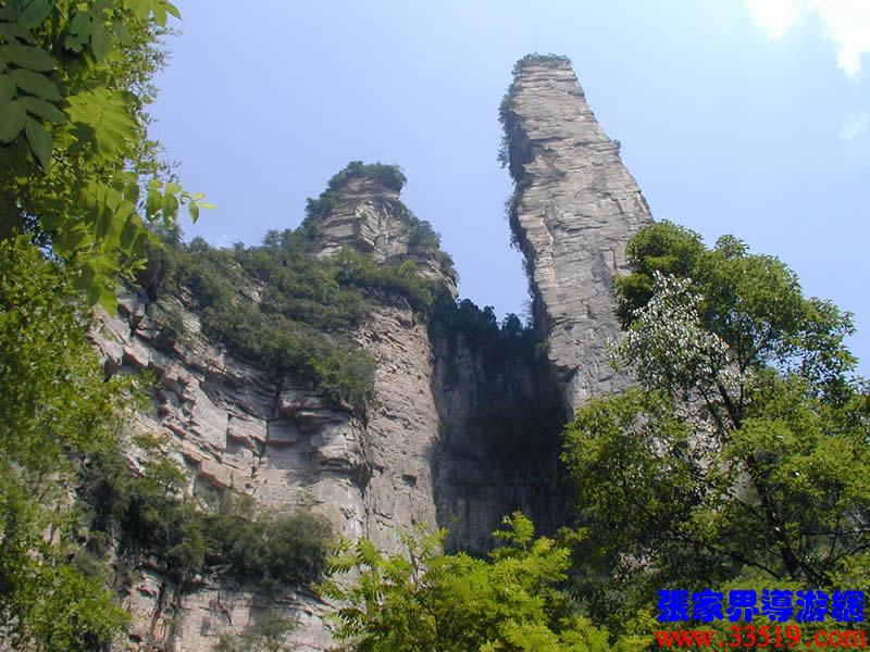 (金鞭巖、神鷹護鞭)如果要問張家界國家森林公園的標志景點,答案是現(xiàn)成的:金鞭巖。早在清代中期,一些文人就把張家界的峰林及百丈峽列入“永定八景”。其一叫“危峽啼猿”;其二叫“層巖涌塔”:“縣西二十里青崖山,其前五山并立,層峙如浮圖。中一峰更峻拔,上插宵漢,晴輝雪積,最擅奇觀。”這里說的“其中一峰”,指的金鞭巖。八大景點張家界占其二,可見先人是有眼力的。金鞭巖相對高度380多米,拔地而起,直插云霄,無論你遠看近看,正看側(cè)看,都是一根刺破青天的長鞭!在金鞭巖左側(cè)的那座巖峰,大家看多像一只兇猛的老鷹,勾嘴瞪眼,雙翅略展,時刻警覺地守護著金鞭,人稱“神鷹護鞭”。