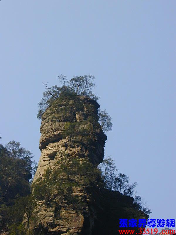 (亂竄坡)左邊這個坡,相傳向王天子兵敗后主力部隊從這里撤退上袁家界,進天子山。這時,官兵追上來了,埋伏上的士兵一刀砍斷葛藤,滾木擂石潮水般砸了下來,打得官兵四處亂竄,以后就把這個坡叫“亂竄坡”。從亂竄坡可以上著名風景游覽線袁家界,那里有后花園、迷魂臺、天下第一橋、天懸白練瀑布;還可以取道上天子山、進楊家寨。大家抬頭看,就是這座孤峰,叫羊寨,那里是一片原始森林。