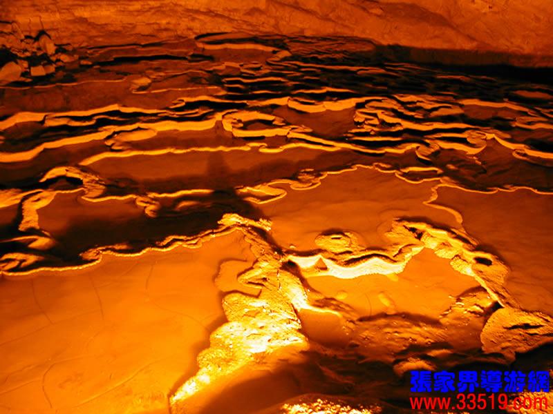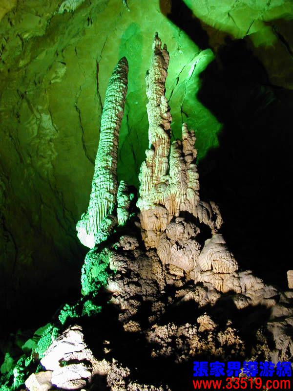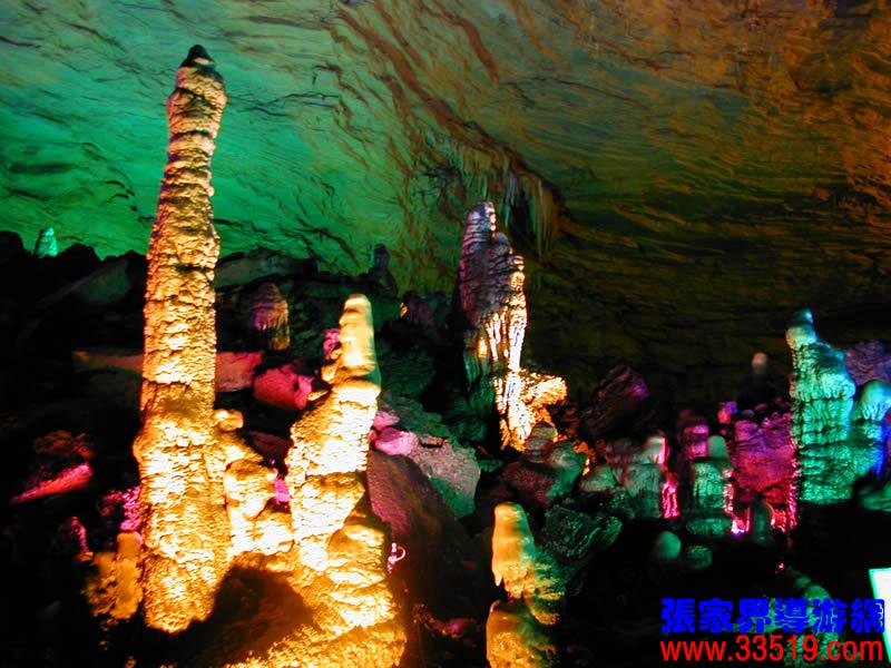 (龍宮)龍宮是黃龍洞十三個大廳中最大的一個,也是景色最美的景點之一,底面積15000平方米,平均高40米,兩千余根石筍拔地而起,千姿百態(tài),異彩紛呈,或如飛禽走獸,或如宮廷珍藏,有的像巍巍雪松,有的像火箭升空。龍宮后園有金銀兩座花池,清水常溢,花簇盛開。宮頂鐘乳柳垂簾掛,四周壁栩栩如生。溶解著各色各樣的礦物質(zhì)的水,從巖層中滲透出來,滴落下來。礦物質(zhì)在洞頂凝固結(jié)晶成倒懸鐘乳石,從鐘乳石滴落的水又把礦物質(zhì)澆疊、堆壘在洞底,而長成節(jié)節(jié)向上的石筍。大家看看這龍宮的造型,領(lǐng)略這磅礴的氣勢。洞內(nèi)最大石筍,高12米、直徑10米的漢白玉天然石椅“龍王寶座”居高臨下,眾多石柱石筍似人似物,維妙維肖,圍著寶座朝拜山呼,幾十座珊瑚亭亭玉立,儼然一支龐大的“宮廷樂隊”。湖南著名教授羊春秋先生作《寄生草》詞對此進行描繪:“百態(tài)千姿模樣,三宮六院門巷。龍王開宴設(shè)瓊漿,猴王偷果鬧天堂,君王納寵擁羅帳。搬演了人間爭攘,匯集了天下奇觀。”