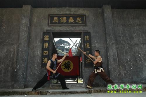 忠義鏢局,它始建于清乾隆四十二年(1777),位于洪江龍船沖,這里會館、錢莊、豪宅林立,堪稱洪江的曼哈頓。與我們在古商城看到的窨子屋不同,這是一座典型的北方四合院,前庭后院,布局嚴(yán)謹(jǐn),軸線明確,左右對稱,主次分明。前院是鏢師練功習(xí)武之地,墻壁上書有“忠”、“孝”、“禮”、“義”四字和“十八羅漢練功圖”;后院為鏢師起居和洽談生意之所,內(nèi)供奉關(guān)武大帝。忠義鏢局主要為豪商巨賈押運銀票、貨物,看家護(hù)院,坐夜守店,也開館收徒,傳授武藝。忠義鏢局的掌門人劉大鵬,湖南長沙人,幼時即入嵩山少林寺習(xí)武,不僅精通十八般武藝,而且頭腦精明,他把鏢局開在這洪江最繁華的金融一條街,足見他的經(jīng)商意識和人面廣了?,F(xiàn)在忠義鏢局現(xiàn)場表演古代押鏢、行鏢全過程,是人們了解中國古代鏢行歷史文化的活性博物館。有興趣的朋友可以去洪江古商城親自感受一下當(dāng)時押鏢的情景吧。
