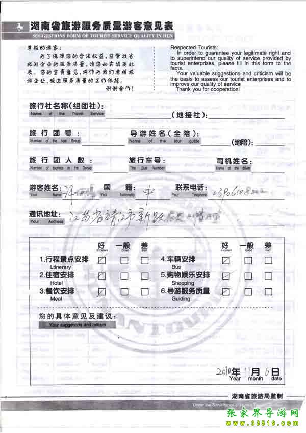 2010年11月6日江蘇許先生旅游質(zhì)量反饋