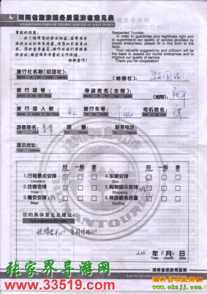 2010年4月4日李小姐一行8人張家界旅游質(zhì)量反饋