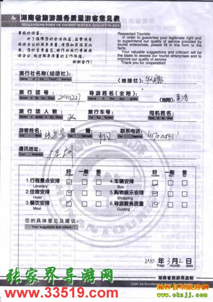 2010年3月2日廣東張先生旅游質(zhì)量反饋