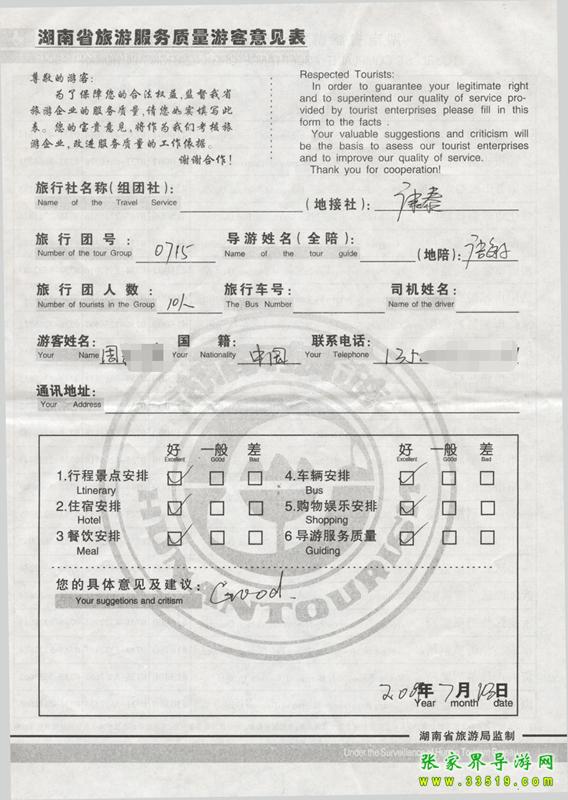 2009年7月15日周女士一行10人質量接待反饋單: