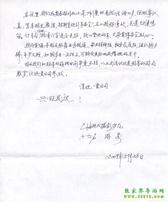 2009年5月19日“上?,F(xiàn)代攝影沙龍”一行16人,參加張家界旅游導(dǎo)游網(wǎng)組織的張家界旅游跟團(tuán),于2009年5月25日結(jié)束行程。游玩期間,由于導(dǎo)游楊蓓的出色講解和周到的服務(wù),得到客人的一致好評??腿颂丶谋頁P(yáng)信一封,如下:
